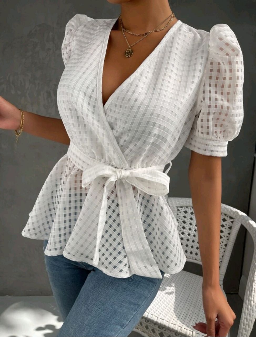 Top de cuello cruzado de manga farol con cinturón