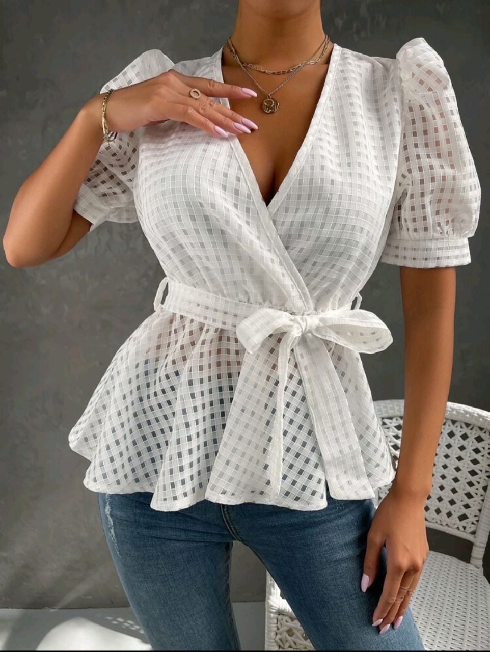 Sé el primero en valorar “Top de cuello cruzado de manga farol con cinturón”